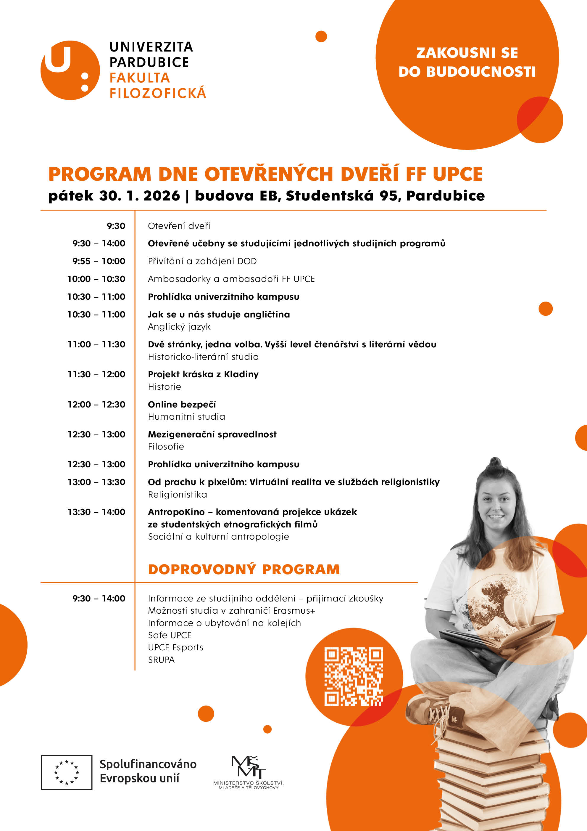 Naši studující tě provedou univerzitním areálem i budovou fakulty, ukážou ti učebny a zázemí a řeknou ti, jak u nás probíhá studium. Po celý den budou otevřené učebny jednotlivých studijních programů, kde se můžeš bavit přímo se studentkami a studenty daného oboru.