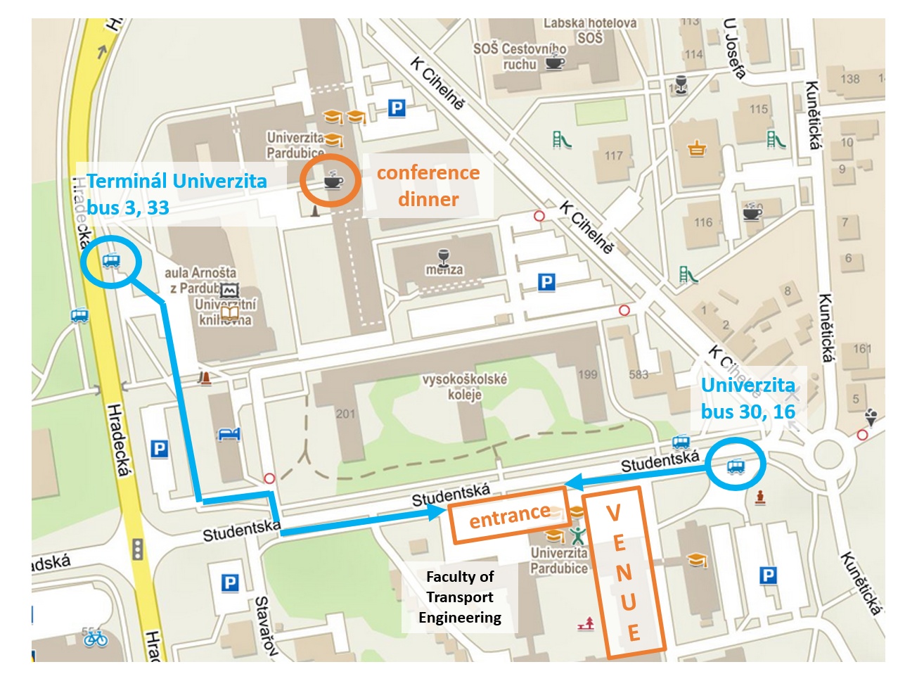 - 3 and 33 (direction Globus or Lázně Bohdaneč) - get off at "Terminál Univerzita" stop. From the bus stop walk along Studentská Street towards the entrance to the Faculty of transport engineering (Building DB). Follow the signs in the corridors to the conference rooms in Building EB.
