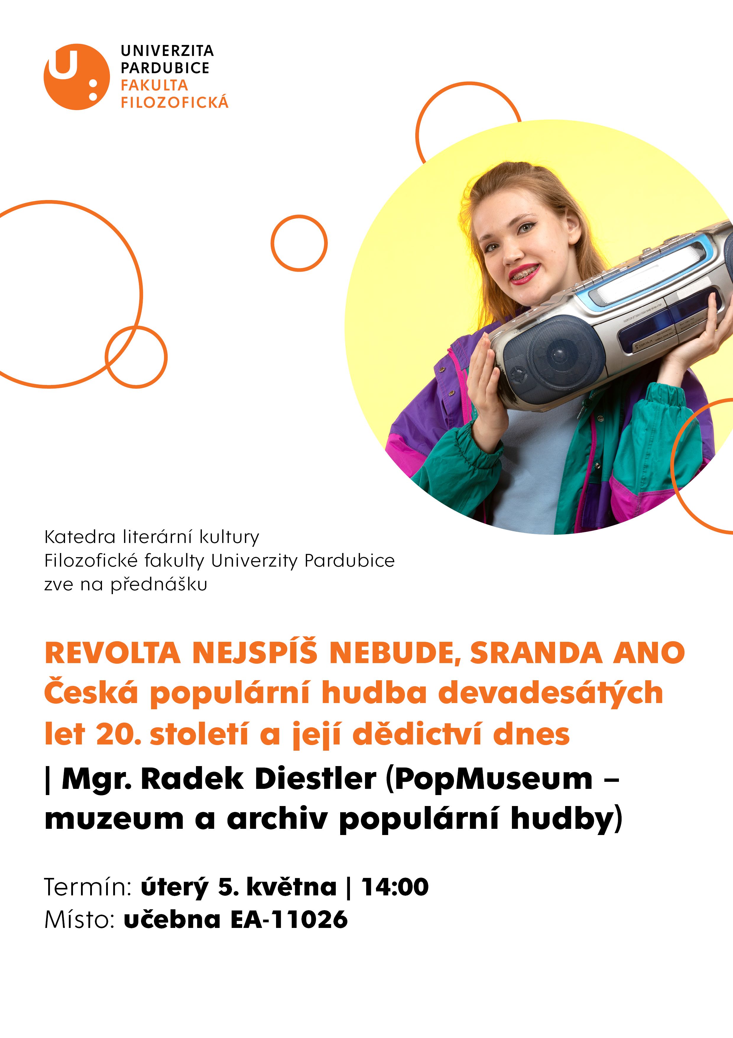 Katedra literární kultury Filozofické fakulty Univerzity Pardubice zve na přednášku REVOLTA NEJSPÍŠ NEBUDE, SRANDA ANO Česká populární hudba devadesátých let 20. století a její dědictví dnes | Mgr. Radek Diestler (PopMuseum – muzeum a archiv populární hudby).